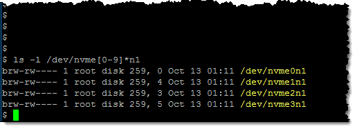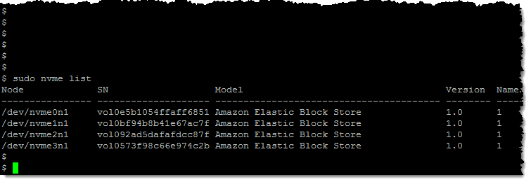 The SN field in the output can be mapped to an EBS volume ID by inserting a “-” after the “vol” prefix (sadly, the NVMe SN field is not long enough to store the entire ID). Here’s a simple script that uses this information to create an EBS snapshot of each attached volume: